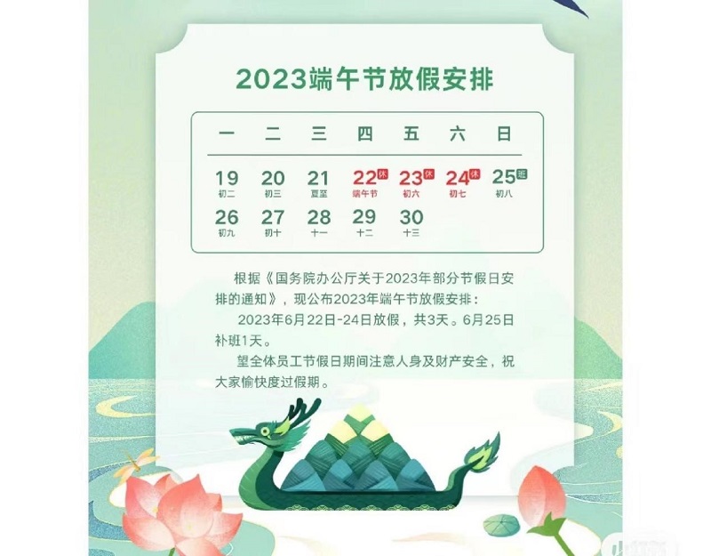 根據(jù)2023年端午節(jié)放假通知精神,放假具體安排通知如下:6月22日至6月24日放假共3天,不調休。