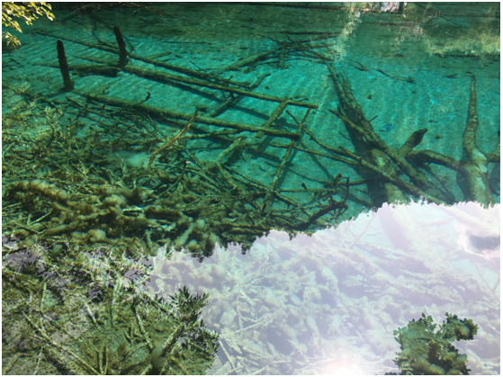 ,五花海的底部景觀妙不可言,湖水一邊是翠綠色的